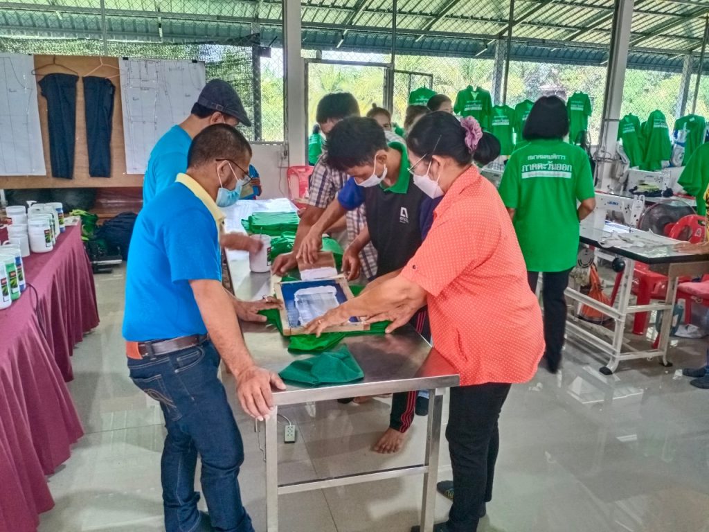 ภาพบรรยากาศการทำซิลค์สกรีนของคนพิการและผู้ดูแลคนพิการที่เข้าร่วมฝึกงานในโครงการฝึกงานมาตรา 35 หลักสูตรช่างตัดเย็บเสื้อผ้า ระดับต้น 600 ชั่วโมง 6 เดือนได้รับการสนับสนันโดย โลตัส บริษัทเอก-ชัย ดีสทริบิวชั่น ซิสเทม จำกัด และสมาคมคนพิการภาคตะวันออก ณ จุดฝึกงาน ชมรมคนพิการทางการเคลื่อนไหวอำเภอแสวงหา จังหวัดอ่างทอง