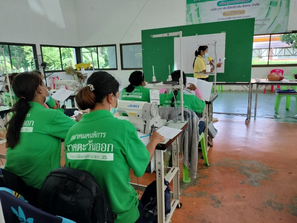 ภาพบรรยากาศการเรียนการสอนการสร้างแบบกระโปรงต่างๆของคนพิการและผู้ดูแลคนพิการที่เข้าร่วมในโครงการฝึกงานมาตรา 35 หลักสูตรช่างตัดเย็บเสื้อผ้า ระดับกลาง 600 ชั่วโมง 6 เดือน ได้รับการสนับสนุนจากบริษัทเอก-ชัย ดีสทริบิวชั่น ซิสเทม จำกัด(โลตัส) และสมาคมคนพิการภาคตะวันออก ณ สมาคมคนพิการด้านการเคลื่อนไหวจังหวัดบุรีรัมย์
