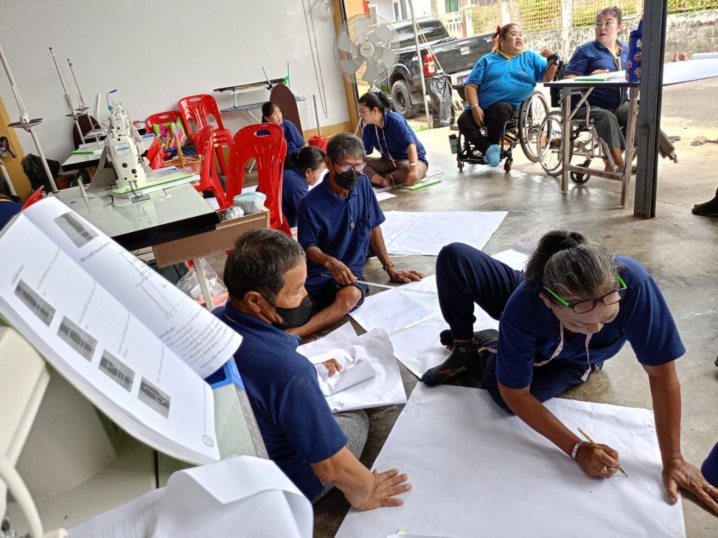 ภาพบรรยากาศการสร้างแบบและตัดเย็บกางเกงขาสั้น หรือกางเกงเจเจของคนพิการและผู้ดูแลคนพิการที่ร่วมในโครงการฝึกงานมาตรา 35 หลักสูตรช่างตัดเย็บเสื้อผ้า 600 ชั่วโมง 6 เดือน ณ จุดฝึกงาน สมาคมแรงงานคนพิการจังหวัดระยอง