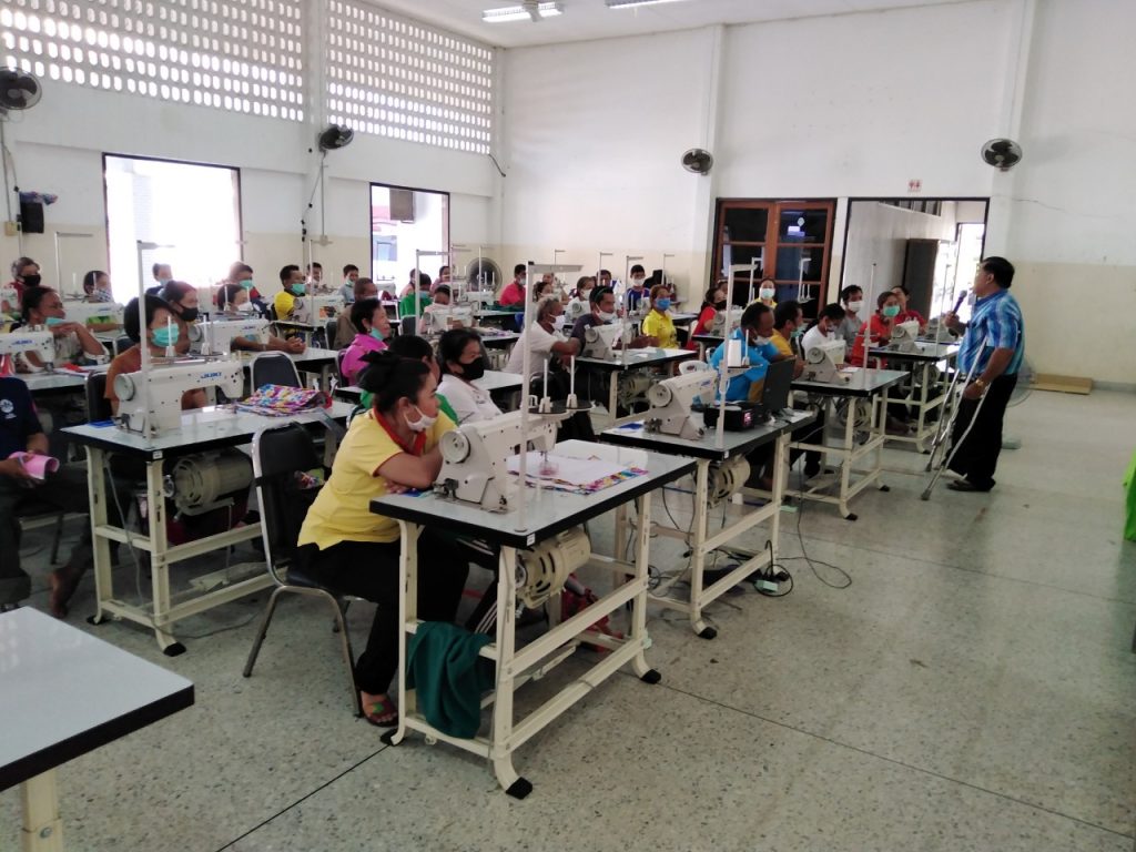 ภาพบรรยากาศกิจกรรมการประกอบธุรกิจส่วนตัวของคนพิการและผู้ดูแลคนพิการที่เข้าร่วมโครงการฝึกงานมาตรา 35 หลักสูตรช่างตัดเย็บเสื้อผ้า 609 ชั่วโมง 6 เดือน สนับสนุนโครงการฯโดย โลตัส บริษัทเอก-ชัย ดีสทริบิวชั่น ซิสเทม จำกัด และ สมาคมคนพิการภาคตะวันออก เพื่อเป็นแนวทางในการนำความรู้ ความสามารถที่ได้รับไปสร้างงาน ประกอบอาชีพ เพิ่มรายได้ให้กับตนเอง และยกระดับคุณภาพชีวิตคนพิการให้ดียิ่งขึ้น ไม่เป็นภาระสังคมและคนรอบข้าง ณ ศูนย์ฝึกอาชีพ สมาคมคนพิการด้านการเคลื่อนไหวหรือร่างกายบุรีรัมย์